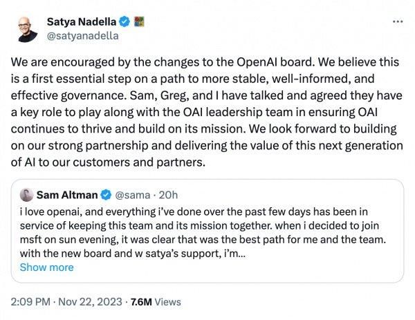 随后,微软CEO萨提亚·纳德拉(Satya Nadella)转发了奥特曼的这条X帖子并写道:“OpenAI董事会的变化,是迈向更稳定、信息更灵通、更有效治理道路上必不可少的第一步。我和奥特曼、Greg进行了交谈,并同意他们在OpenAI领导团队中发挥关键作用,以确保OpenAI继续蓬勃发展并实现其使命。我们期待在我们强大的合作伙伴关系基础上,为我们的客户和合作伙伴提供下一代人工智能的价值。”
