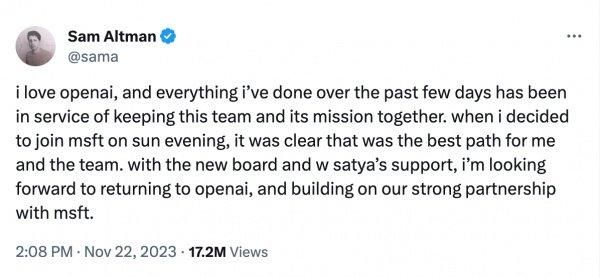 各方都已经发布奥特曼回归的消息,似乎这场闹剧将到此画个句号。奥特曼在X上写道,“我热爱OpenAI,过去几天我所做的一切,都是为了让这个团队及使命保持团结。在新董事会和萨提亚的支持下,我期待回到OpenAI,并与微软建立牢固的合作伙伴关系。”