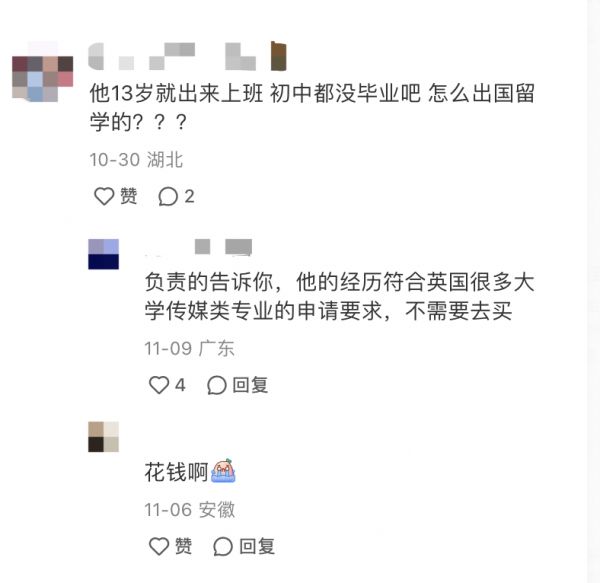当然也不乏质疑的声音,有人表示“他13岁就出来上班,初中都没毕业吧,怎么出国留学的”“大概率镀金去了”“能不能来英国把卫生纸的价格打下去?”