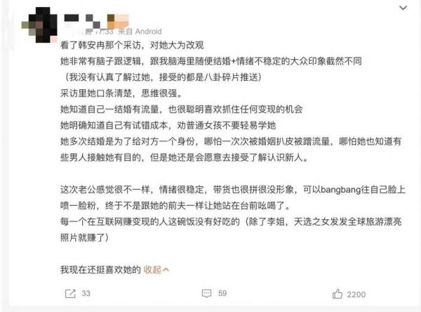从网友的反馈来看,虽然争议也不小,但与小七有同样观点的不在少数。不少人开始对其改观,认为“之前看她也是个笑话,刷到这个采访觉得脑子其实挺清晰的、也很聪明。”虽然与殷世航这种彻底转型的路径不同,但韩安冉显然也通过清醒发言正逐步扭转大众形象。