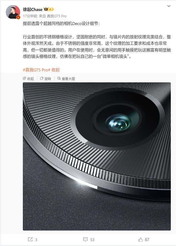IT之家 11 月 24 日消息,realme 副总裁 @徐起 Chase 今天下午对新机 realme 真我 GT5 Pro 进行预热,透露该机的部分相机 Deco 设计细节。