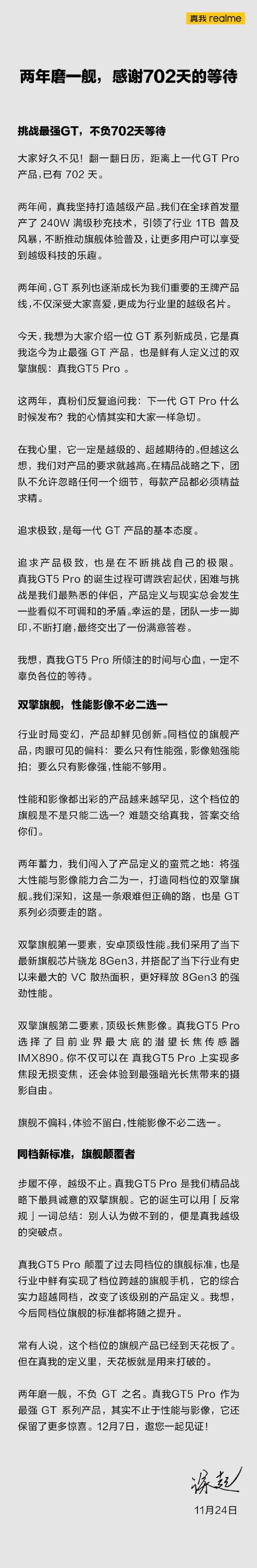 同时,徐起在评论区中透露了更多新机的细节,如屏幕形态为微曲、行业顶级等。他在今天上午的一条长微博中宣称,真我 GT5 Pro 将颠覆过去同档位期间标准,今后同档位旗舰的标准“都将随之提升”。