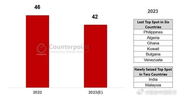 11月24日消息,根据市场调查机构 Counterpoint Research 公布的最新报告,预估 2023 年三星在全球 42 个国家和地区的手机市场保持行业第一的位置,相比较去年的 46 个,减少了 4 个。该机构目前追踪了全球 74 个国家和地区的智能手机销售情况,预估 2023 年三星在菲律宾在内的六个国家失去第一宝座,不过在印度和马来西亚重新夺回头把交椅。该机构表示三星受到小米、TECNO、realme 和苹果等手机厂商的竞争,在 6 个市场失去第一宝座。不过三星今年有望超越小米,在印度和马来西亚占据榜首位置。三星一直在采用多种策略来占领印度市场。(IT之家)