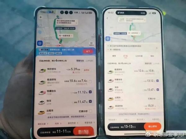 除此之外,不同的手机,获得的优惠券情况不同,以快车选项为例,如果加上优惠券金额,总价来进行对比的话,不同手机,同一时间同一路线,有的价格相差无几;有的价格相差7元。另外,据亲测显示,在价格相差7元的这条线路上,确实苹果手机打车价格要比华为手机更贵。