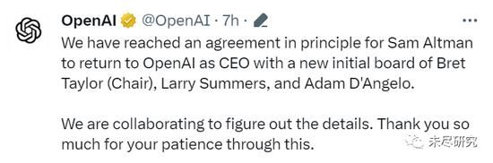 奥特曼回归的消息,发表于OpenAI在社交媒体X的官方账号,还没有同步出现在官网上。这与当初董事会开除奥特曼时不一样。