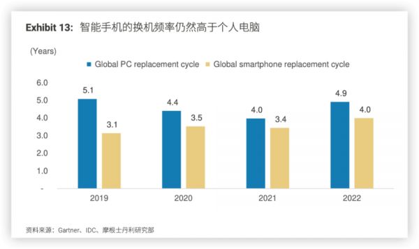 该行称,市场目前普遍对智能手机市场持悲观态度,主要是因为有PC市场的前车之鉴。担忧手机会像PC那样,由于缺乏新功能、换机周期拉长、市场饱和以及消费者对宏观经济指标(尤其是通胀和可支配收入)较为敏感,而出现多年下行周期。