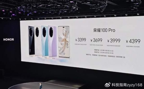 最后,价格方面,荣耀100提供了四种存储组合,分别是12+256GB售价2499元、16+256GB售价2799元、16+512GB售价2999元,配色有亮黑色、迷蝶蓝、莫奈紫、月影白四款可选。而荣耀100 Pro则相对高端,提供12+256GB售价3399元、16+256GB售价3699元、16+512GB售价3999元,16GB+1TB售价4399元,同样有亮黑色、迷蝶蓝、莫奈紫、月影白四款可选。