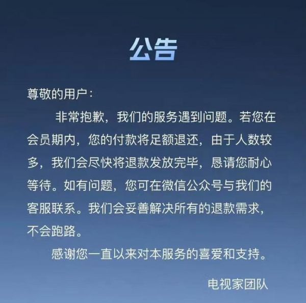 在登上微博热搜的当天晚上,“电视家”官方微博“电视家助手”发布公告,表示“非常抱歉,我们的服务遇到问题,我们会妥善解决所有的退款需求,绝对不会跑路!”