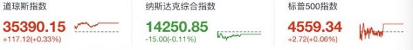道琼斯指数收于35390.15点,上涨117.12点,涨幅0.33%;标准普尔500指数收于4559.34点,涨幅0.06%;纳斯达克综合收于14250.85点,跌幅0.11%。