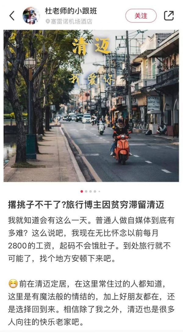 同样怀疑自己做旅行博主的决策理性程度的,还有因为入不敷出而滞留在清迈的阿杜。“年收入3000元,滞留清迈”是他最近在小红书账号“杜老师的小跟班”更新的一条内容。
