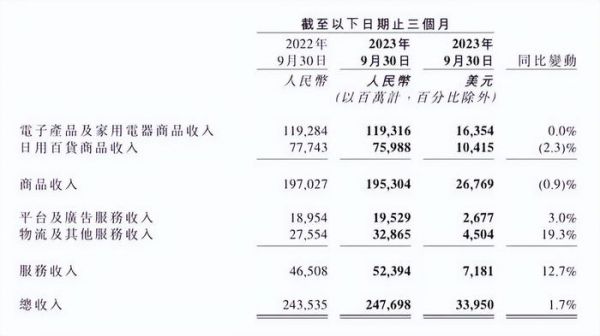 因此可以看到,京东的相关业务也受到一定冲击,但总体保持稳健。据悉,京东的收入主要由商品与服务两大部分构成。其中,商品业务第三季度实现收入1953.04亿元,同比微降0.9%。该业务板块内,核心品类电子产品及家用电器实现收入1193亿元,与去年同期相比持平;日用百货商品收入则为759亿元,同比微降2.3%。