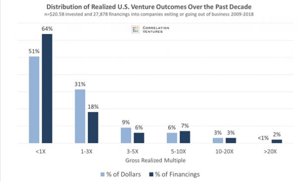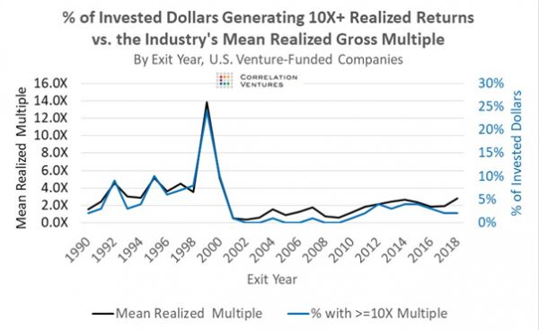 图1:过去十年投资于退出的美国初创企业的风险投资,只有4%获得了10倍或以上回报