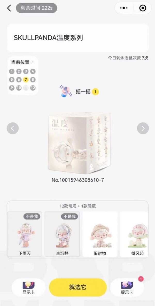 尽管没有时间到泡泡玛特门店,潮玩上新时,汪小颖偶尔还会通过小程序的抽盒机来买玩具,她表示:“小程序上互动感很强,既可以模拟摇一摇,也可以分享给好友让大家一起来猜,单价69元,定价在可以接受的范围内,一个月买几个也无妨,是一种成本不高的快乐体验。”