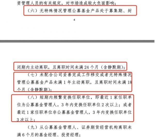 未配合公司妥善完成工作移交或者无特殊情况管理公募基金产品未满1年主动离职,且离职时间未满18个月(含静默期);
