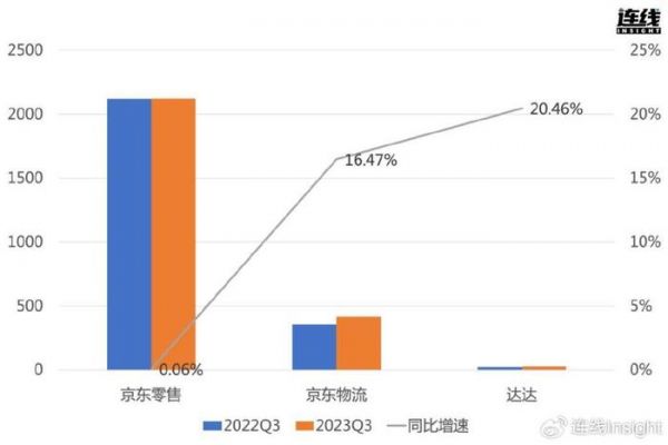 2022Q3-2023Q3京东核心业务的营收规模和同比增速,连线Insight制图