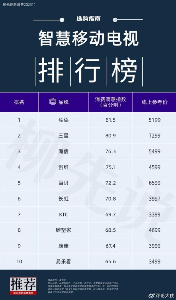 智慧移动电视排行榜1-5名:添添、三星、海信、创维以及当贝。添添排在榜首位置,消费满意指数达81.5,是小度旗下全新科技潮牌。汇集前沿的AI技术能力与服务,为具备年轻心态、热爱新事物的用户,提供更好的智能体验。