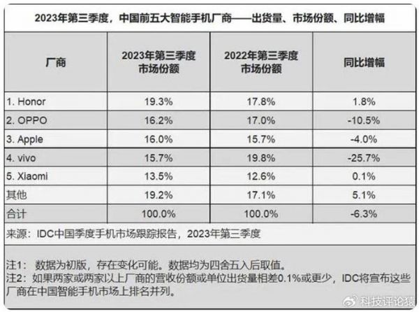 IDC发布的2023年第三季度国内智能手机市场数据显示,排名前五的品牌当中vivo、OPPO、苹果市场份额均出现下滑,其中vivo市场份额从19.8%降至15.7%,下滑25.7%;排名第一的荣耀和排名第五的小米市场份额微增。反而是被归为“其他”的品牌,市场占有率从去年同期的17.1%提高到19.2%,增幅为5.1%。