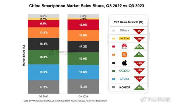 Counterpoint报告中关于国内智能手机市场第三季度的数据,进一步证明了华为手机的回归。华为本季度销量逆势增长37%,目前排名第六,市场占有率为12.9%。小米和荣耀保持了小幅上涨,realme大跌23%,OPPO、vivo、苹果跌幅均超过10%。Counterpoint提供的数据显示,华为Mate60系列的出货量在第三季度已经超过了200万台。