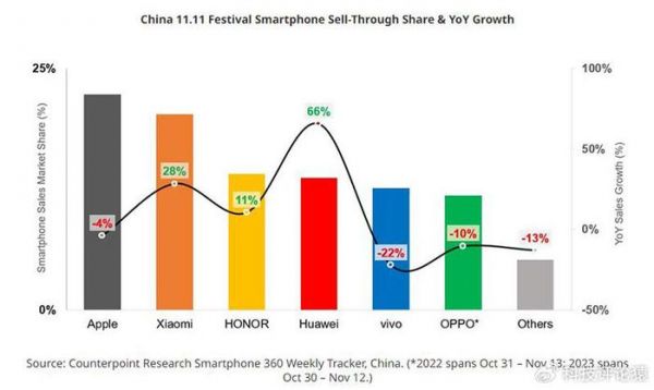 我们还可以选择最近的销售季双11的销售数据来进一步分析。根据Counterpoint每周智能手机销售数据跟踪,在双11期间(10月30日~11月12日)期间,华为手机销售份额同比增长66%,小米同比增长28%,荣耀同比增长11%,而vivo下滑22%,OPPO下滑10%,苹果下滑4%。