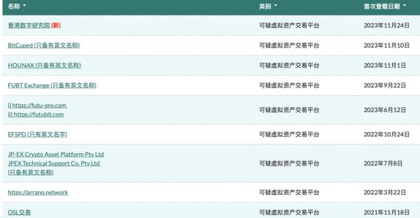 证监会官网的“无牌及可疑虚拟资产交易平台”名单主要列出“未在香港领取牌照”却以香港投资者作为推销对象的公司,目前共有包括HOUNAX、JPEX、香港数字研究院、BitCuped、FUBT、futubit、futupro等9家公司。