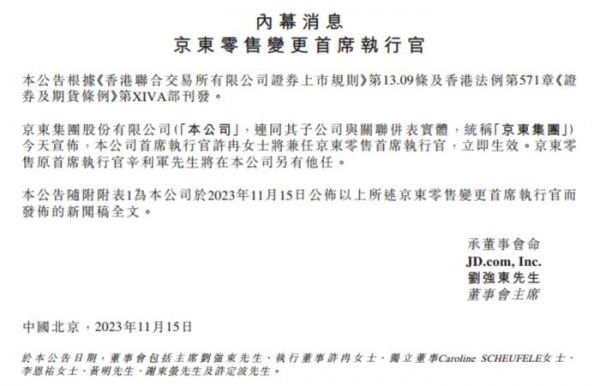 事情就发生在11天前,京东在11月15日发布公告,本公司CEO许冉女士将兼任京东零售的CEO,立即生效。京东零售原CEO辛利军先生将在本公司另有他任。