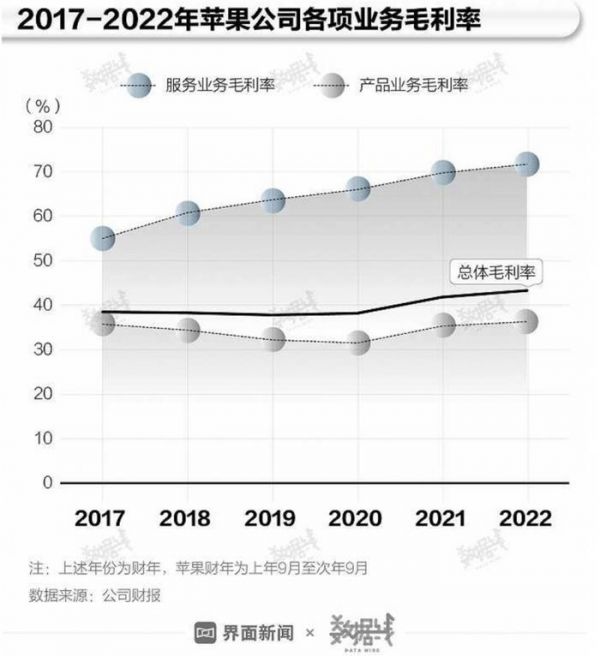 2017-2022年苹果公司各项业务毛利率/图源界面新闻-数据线与“苹果税”相比,“安卓税”并非对所有软件消费都进行抽成,其主要抽税对象是那些支持氪金消费的手机游戏。