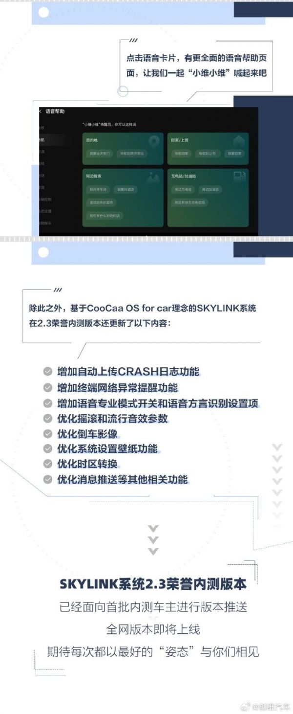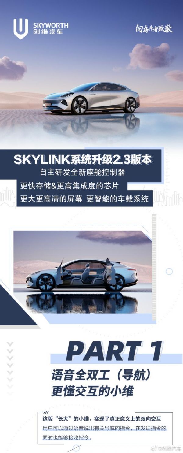 创维EV6车型OTA升级SKYLINK 2.3:新增小维GPT及行车记录仪等