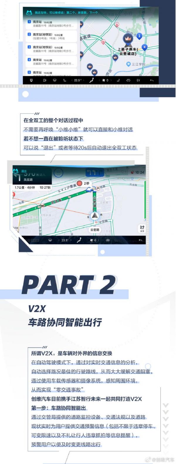 语音助手实现“真正意义上的双向交互”:用户可通过语音说出有关导航指令,在发送指令的同时也能接收指令,不需要“小维小维”提示词就可直接与语音助手对话。若要退出聆听状态,可直接说“退出”或等待 20 秒。