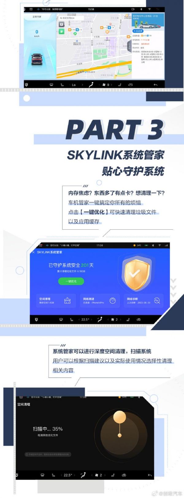 SKYLINK 系统管家:内置车机管家,可通过“一键优化”快速清理垃圾文件及应用缓存,支持深度空间清理、网络诊断。