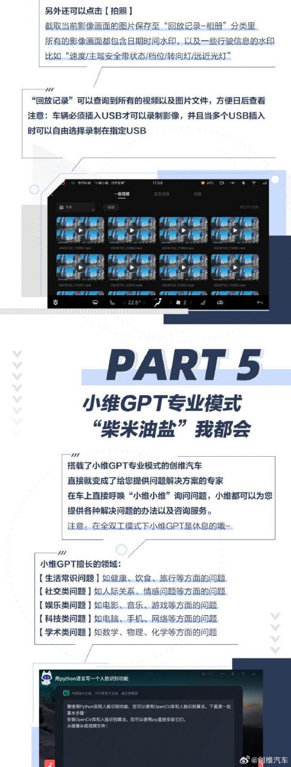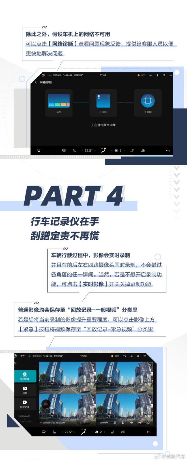行车记录仪:车辆行驶过程中,前后左右四路摄像头会同时录制,还可截取当前影像画面图片保存至相册,影像画面包含时间日期、行驶信息等内容水印。车辆必须插入 USB 才可录制影像。