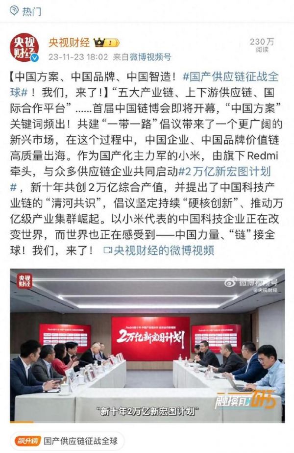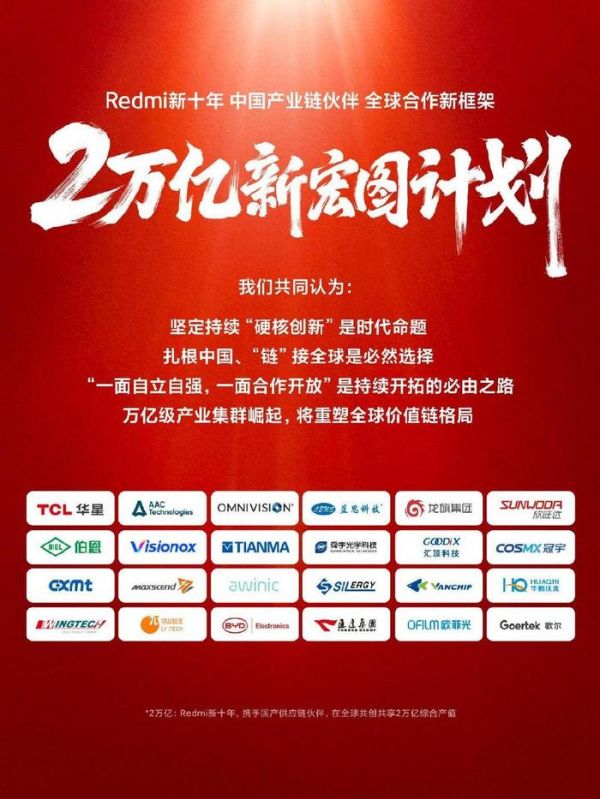 其中Redmi推出的两万亿宏图计划尤为令人瞩目,近期由Redmi牵头、和国产供应链伙伴提出了2万亿新宏图计划,达成了中国科技产业链的“清河共识”,这无疑是个产业级的大事件,更是被央视报道和点赞。