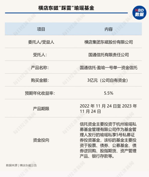 基本信息显示,该信托理财产品委托人/受益人为横店东磁,购买金额为3亿元(公司自有资金),预计年化收益率为5.5%,产品期限为2022年11月24日至2023年11月24日。资金投向为,主要投资于杭州瑜瑶私募基金管理有限公司(下称“瑜瑶基金”)作为基金管理人发行的瑜瑶私享5号私募证券投资基金。