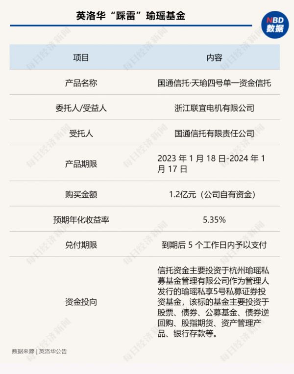11月25日,另一家上市公司英洛华也披露相关公告。2023年1月18日,英洛华的全资子公司联宜电机与国通信托签署了《国通信托·天瑜四号单一资金信托信托合同》,以闲置自有资金1.2亿元向国通信托认购了“国通信托·天瑜四号单一资金信托”。上述信托理财产品尚未到期,联宜电机已累计收回436.92万元。联宜电机已收到国通信托的临时信息披露公告,提示信托财产变现存在重大不确定性。