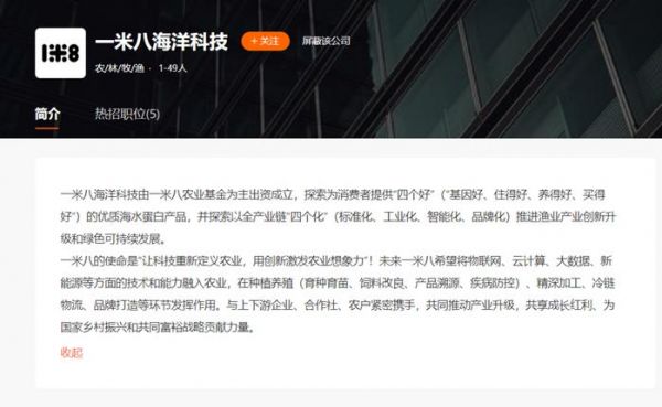 从经营范围推测,“一米八海洋”的布局重心是水产食品。据招聘信息显示,该公司由一米八农业基金出资成立(占股55%),探索为消费者提供“四个好”的优质海水蛋白产品。