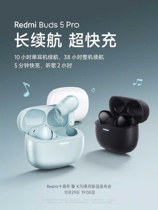 小米Redmi Buds 5 Pro耳机预热:快充5分钟连续听歌2小时