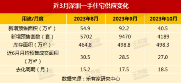 根据乐有家研究中心数据,10月深圳新增一手住宅预售40.5万平方米,库存量仍维持在高位,近500万平方米,去化周期上升至18.5个月。虽然从月度的成交情况来看,10月一手住宅成交2654套,环比上涨了28%,与8、9月的成交数据相比有所回升,但整体月度成交量仍处于历史低位水平。