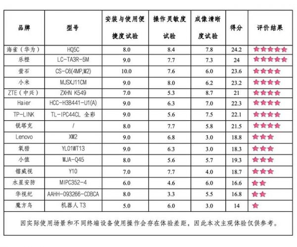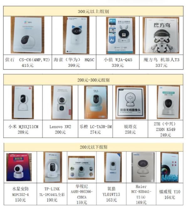 据介绍,此次比较实验从线下、电商平台随机购买了包括海雀(华为)、小米、萤石、联想等品牌在内的 15 款家用摄像头,单价从 150 元-415 元不等。