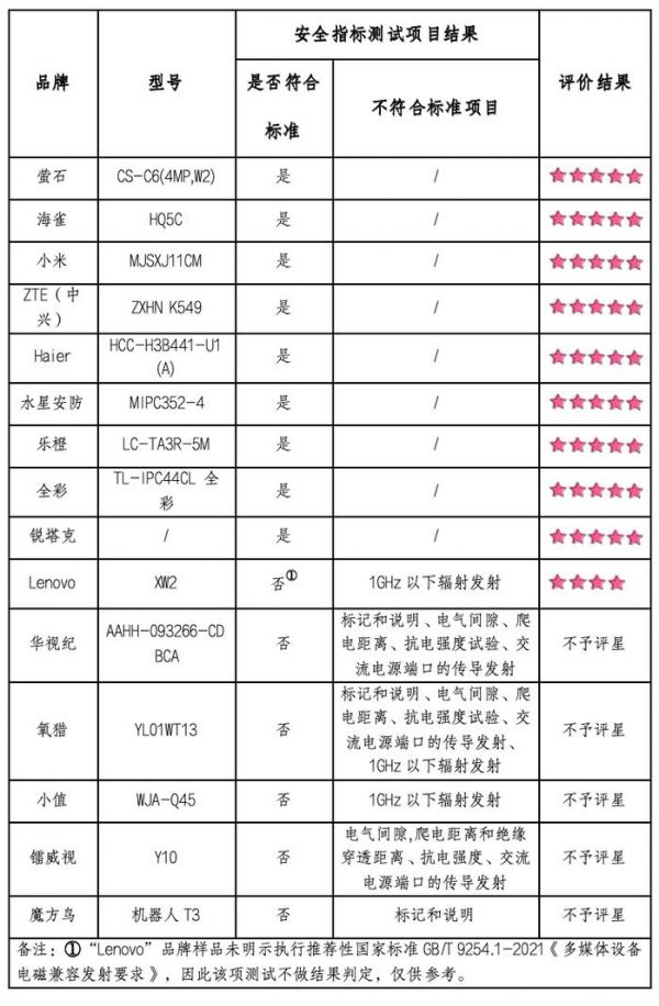9 款样品“小米、海雀(华为)、Haier、乐橙、水星安防、萤石、TP-LINK、锐塔克、ZTE(中兴)”,符合 GB4943.1-2022 和 GB8898-2011 有关电气安全指标标准。