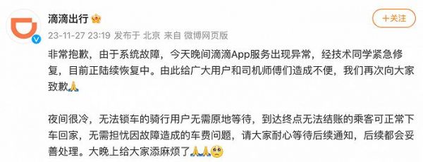 11月27日晚间,“滴滴崩了”登上热搜。全国多地网友在社交平台反馈称,滴滴出行APP“崩了”,不显示定位且无法打车。对此,@滴滴出行 回应称,非常抱歉,由于系统故障,今天晚间滴滴App服务出现异常,经技术同学紧急修复,目前正陆续恢复中。无法锁车的骑行用户无需原地等待,到达终点无法结账的乘客可正常下车回家,无需担忧因故障造成的车费问题,请大家耐心等待后续通知,后续都会妥善处理。