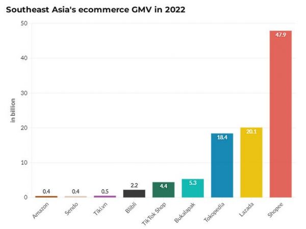 从规模来看,Shopee霸主地位也相当稳固。数据显示,Shopee东南亚2022年GMV规模达479亿美元,占据当地近一半市场份额,Lazada和Tokopedia则位列其后,三者共同瓜分了东南亚市场的半壁江山。