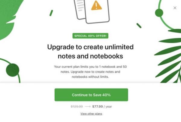 据悉,一些 Evernote 用户收到了弹出消息,宣布未来免费计划将“仅限于一本笔记本和 50 条笔记”。该弹出窗口还鼓励用户升级到付费计划,声称将提供“40% 的特别折扣”,首年仅需 77.99 美元(IT之家备注:当前约 558 元人民币),可以无限制地让用户创建笔记和笔记本。