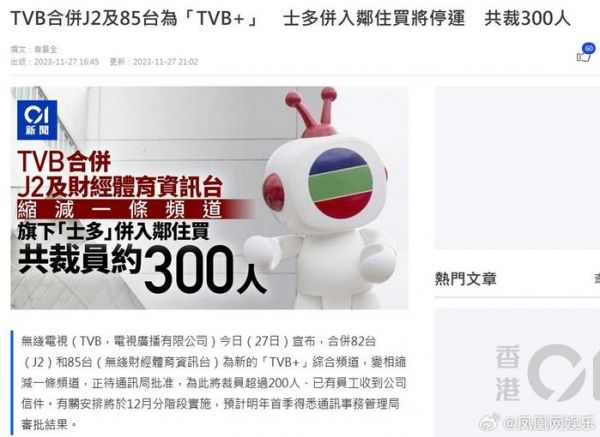 【#TVB将裁员超300人#】#TVB宣布将裁员超300人#11月27日,据港媒报道,电视广播有限公司宣布重组业务,裁减超过300人。TVB将合并J2台和财经体育资讯台,并推出新频道“TVB+”,电视业务会裁员逾200人;而电子商贸业务方面,亦将合并“士多”及“邻住买”,预计该部分裁逾100人,意味着此次重组裁员超过300多人。TVB已于27日向通讯局提交申请,一旦获得批准后,公司将执行该计划,并预计将在2024年首季度得知申请结果。