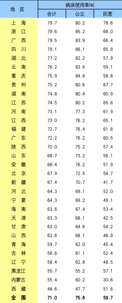 从病床使用率来看,上海病床平均使用率达79.7%,浙江次之;病床使用率相对靠后的分别是西藏、内蒙古和黑龙江;分医疗卫生机构来看,医院的病床使用率最高,为71%,基层医疗卫生机构的病床使用率则仅有46%。