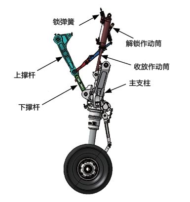 起落架收起时,解锁作动筒供压克服锁弹簧/气压的作用使下位锁解锁,收放作动筒收缩驱动起落架主支柱绕转轴旋转收起,撑杆和锁杆随动折叠,当运动到位时,起落架锁柱撞击上位锁锁钩,完成起落架收起锁定。起落架放下时,上位锁解锁,起落架主支柱在收放作动筒和重力的作用下沿转轴转动放下,当接近放下锁定位置时,锁杆在锁弹簧/气压的作用下完成放下锁定。