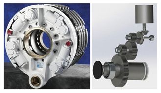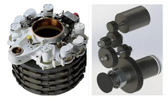 卧式结构(见图6)则是电机轴与输出轴垂直布置,这种布置方式在全电刹车机轮上也比较常见,其特点是对机轮轴向空间需求较小,对机轮轴向空间需求较大,减速施力机构可均布于汽缸座上,在一定空间范围内,刹车行程可做到与液压刹车系统相同。