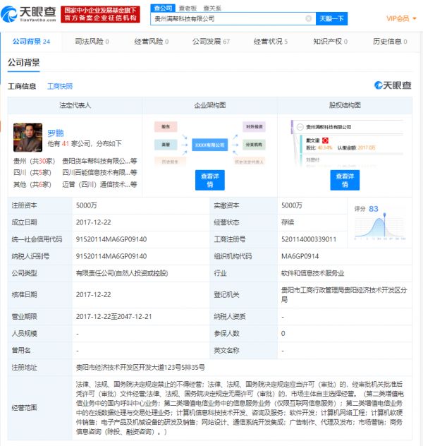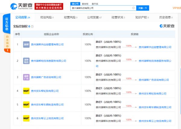 天眼查数据显示,满帮集团所属公司主体为贵州满帮科技有限公司,成立时间为2017年12月,由江苏运满满、贵阳货车帮两家公司合并组成,将通过大数据与人工智能降低货车司机的空驶率、提高货运效率,打造一个连接人、车、货三个维度的超级数据平台。据了解,运满满CEO张晖和货车帮CEO罗鹏兼任集团联席总裁。