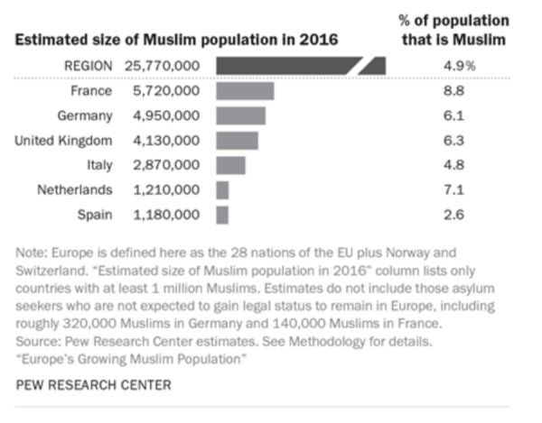 现在7年过去,欧洲穆斯林的数量绝对已经超过3000万人,穆斯林的生育率再加上移民速度导致其人口比例在欧洲不断上升。