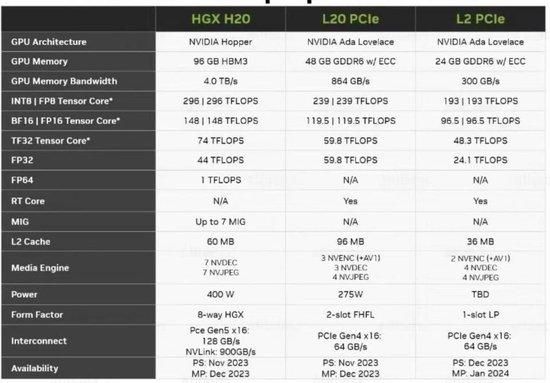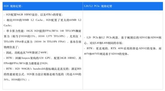 具体到H20/L20,这两款特供产品,是如何通过H800、L40S降规而来?可以先看看相关参数