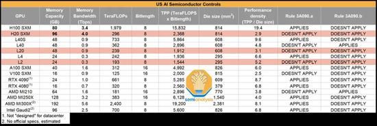 核心AI芯片相关参数及出口管制情况,APPLIES对应受管制,DOESN‘T APPLY对应不受管制
