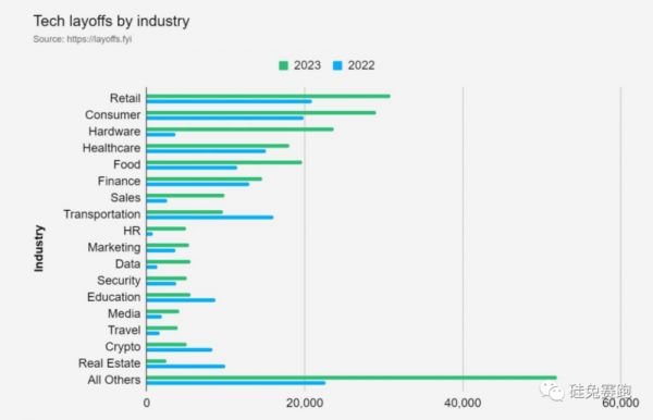 然而,从2022年下半年开始,裁员数量急剧上升,并几乎波及到各行各业,如下图所示。